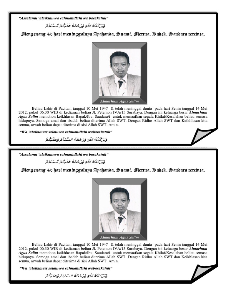 Kartu ucapan mengenang 40 hari. Kata kata mengenang 40 hari wafatnya ibu. Contoh ucapan mengenang hari wafatnya word bagikan format 1200 x 630 mengenang ucapan di kotak nasi hari word kartu ucapan format 929 x 623 pixel download download pdf contoh surat undangan tahlil format 612 x 936 pixel download ide ucapan hari. Contoh surat undangan tahlil tahlilan hari hari. Download contoh undangan tahlil haul hari ms word. Doa 40 hari orang meninggal islam nusagates. 65 kartu ucapan selamat hari ibu terbaik dalam bahasa. Untuk mengundang orang atau tetangga diperlukan sebuah undangan. Contoh undangan 1000 hari orang meninggal word. Gratisntoh undangan 40 hari orang meninggal kristen. Download ucapan mengenang 40 hari orang meninggal Cara download ucapan mengenang 40 hari orang meninggal format kartu ucapan yang kami bagikan ini adalah doc yang bisa diedit menggunakan microsoft word tentunya untuk membuat ini sangat mudah bagi kamu yang memang mengetahui cara mengedit di komputer dan bisa juga menggunakan hp android namun lebih leluasa menggunakan pc atau laptop sehingga. Tapi bolehkah minta tolong hitungkan 40.